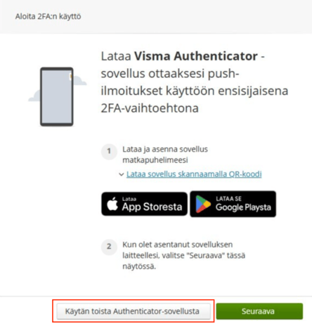 - Aloita 2FA:n käyttö ja ohjeistus tähän liittyen: "Lataa Visma Authenticator -sovellus ottaaksesi push-ilmoitukset käyttöön ensisijaisena 2FA-vaihtoehtona":