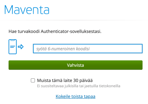 Maventaan kirjautumiseen sopii autentikaattori-sovellus, joka tukee kaksivaiheista tunnistautumista ja luo 6-numeroisen koodin (esim. Google Authenticator, Microsoft Authenticator, Visma Authenticator).