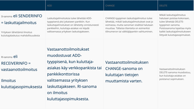 - Mikäli muutettavaa laskuttajailmoitusta ei löydy, tulisi lähettää uusi laskuttajailmoitus eli ADD sanoma tähän pankkiin.