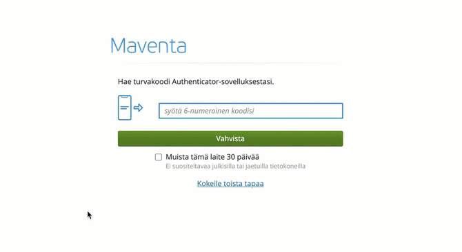 - Syötä autentikaattorin koodi: Hae 6-numeroinen koodi autentikaattoristasi, kirjaa se sille varattuun kenttään ja paina "Vahvista".