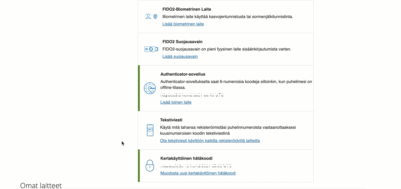 Ota tekstiviesti-vahvistus käyttöön autentikaattorin rinnalla tallentamalla puhelinnumerosi käyttäjätunnuksen asetuksiin ja aktivoimalla tekstiviestien vahvistus asetuksista. Kirjautuessasi käyttäjätunnuksella ja salasanalla voit valita "Kokeile toista tapaa" autentikaattorikoodin syötön sijaan. Vaihtoehtoisena tapana valitse "Katso tekstiviestinä lähetetty turvakoodi puhelinnumerosta, joka loppuu ...".