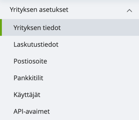 - Päivitä laskutusosoite: Lisää laskutustiedot, jonne Maventan palveluista muodostuva lasku lähetetään. Valitse verkko-, sähköposti- tai postiosoite kohdasta Asetukset > Yrityksen asetukset > Laskutustiedot.